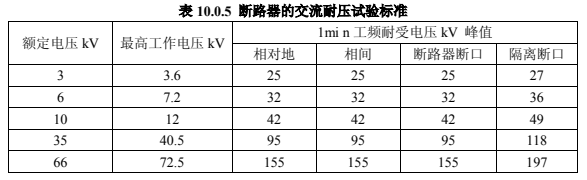 在斷路器合閘及分閘狀態下進行交流耐壓試驗時:當在合閘狀態下進行時,試驗電壓應符合表 10.0.5 的規定。當在分閘狀態下進行時,真空滅弧室斷口間的試驗電壓應按產品技術條件的規定,試驗中不應發生貫穿性放電。
