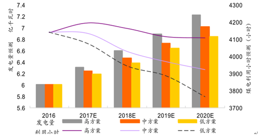 按照我國第十三個五年計劃的規劃,到2020年,我國的煤電的發電總量將會是11億千瓦,其占全社會的總發電量將進一步縮減4%左右,2017~2020發電量及發電小時預測如下圖: